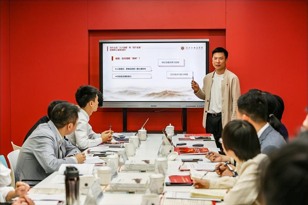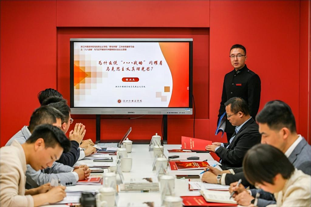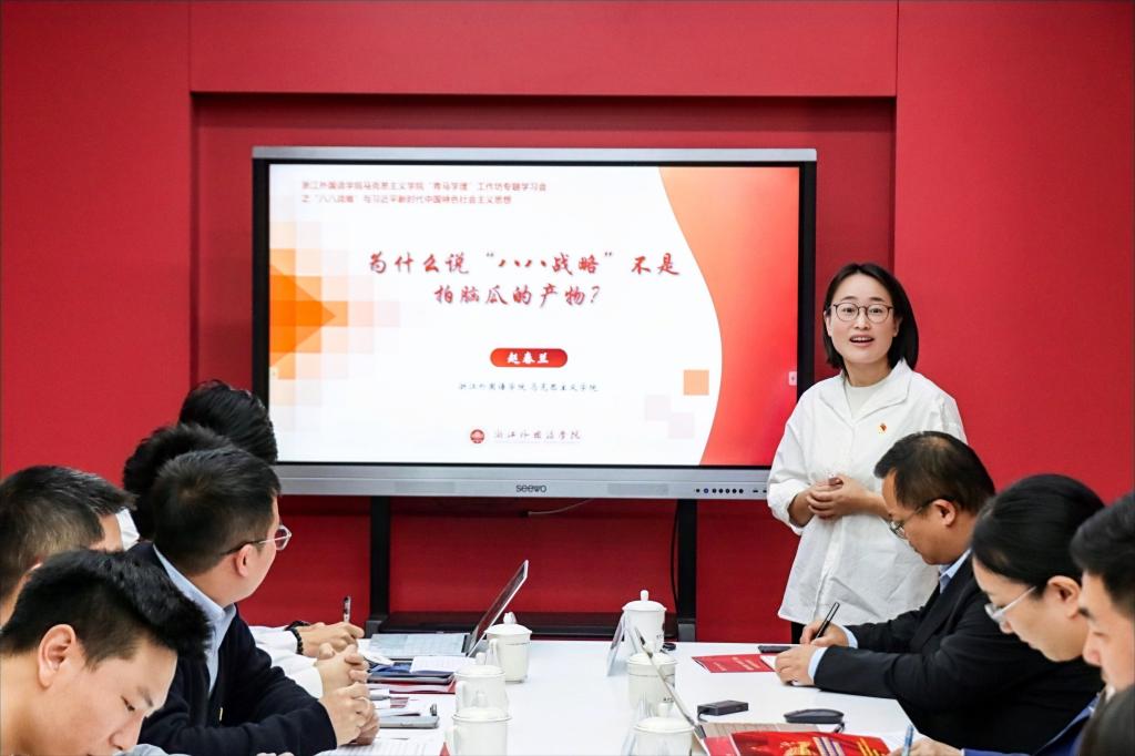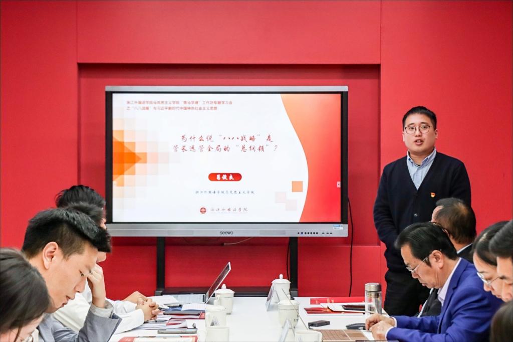 欧万彬、葛俊良、赵春兰、郑宇龙、程丛杰五位青年教师通过“六分钟精讲”,从浙江实践解析“八八战略”的时代价值,对习近平新时代中国特色社会主义思想进行了生动的学理阐释。