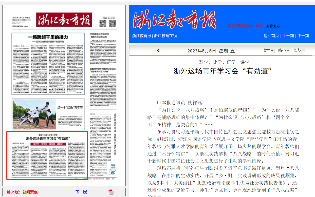 4月27日-5月5日,《浙江教育报》头版、中国社会科学网、中新网、中国蓝新闻、潮新闻、浙江之声、中国教育在线分别以《浙外这场青年学习会“有劲道”》《浙江外国语新澳门六合彩走势图