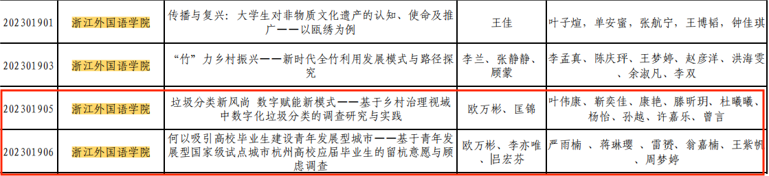 欧万彬老师指导的作品《垃圾分类新风尚 数字赋能新模式——基于乡村治理视域中数字化垃圾分类的调查研究与实践》(项目编号:202301905;项目负责人:叶伟康)《何以吸引高校毕业生建设青年发展型城市——基于青年发展型国家级试点城市杭州高校应届毕业生的留杭意愿与顾虑调查》(项目编号:202301906;项目负责人:严雨楠)均获铜奖。