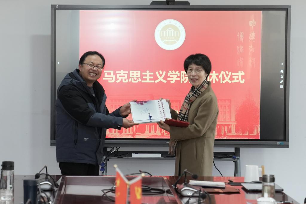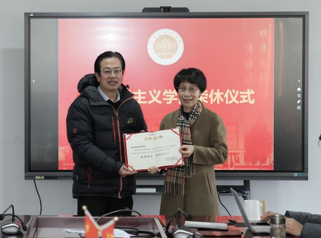 院长王建新为潘迎华老师颁发荣休证书,副院长方浩代表新澳门六合彩走势图