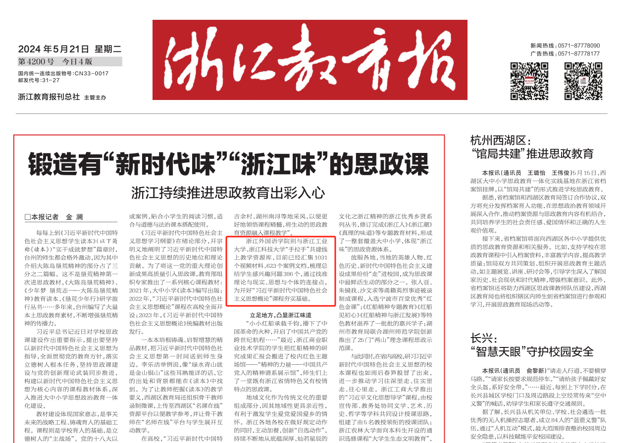 5月21日,浙江教育报头版头条以“锻造有‘新时代味’‘浙江味’的思政课”为题,其中,报道了我校推进思政教育出彩入心的做法。