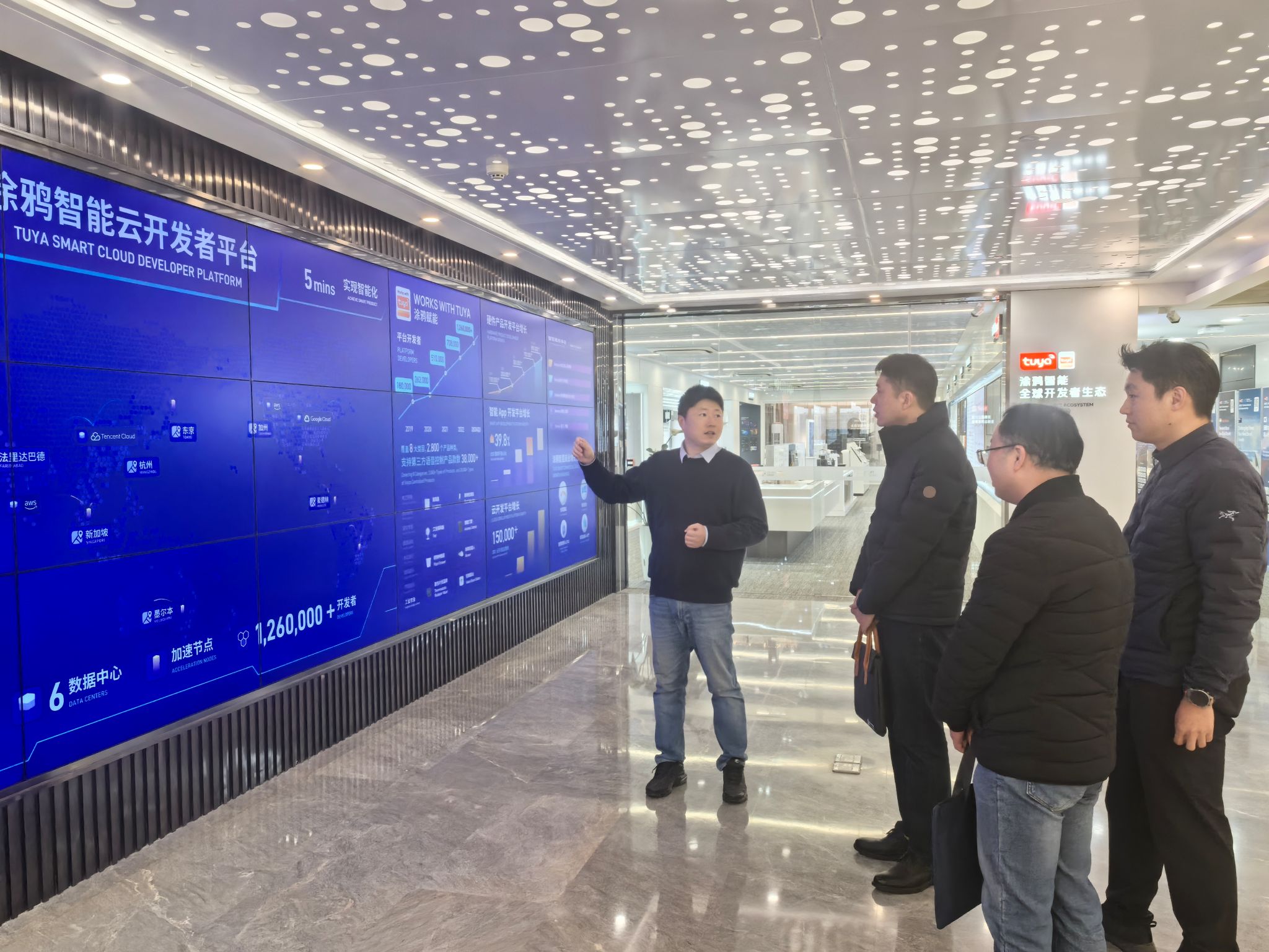一行参观了涂鸦智能企业体验馆,详细介绍了涂鸦智能在硬件智能化、智慧商业等方面的具体应用以及海外各个国家的智能化市场情况。参观结束后,双方进行了座谈。