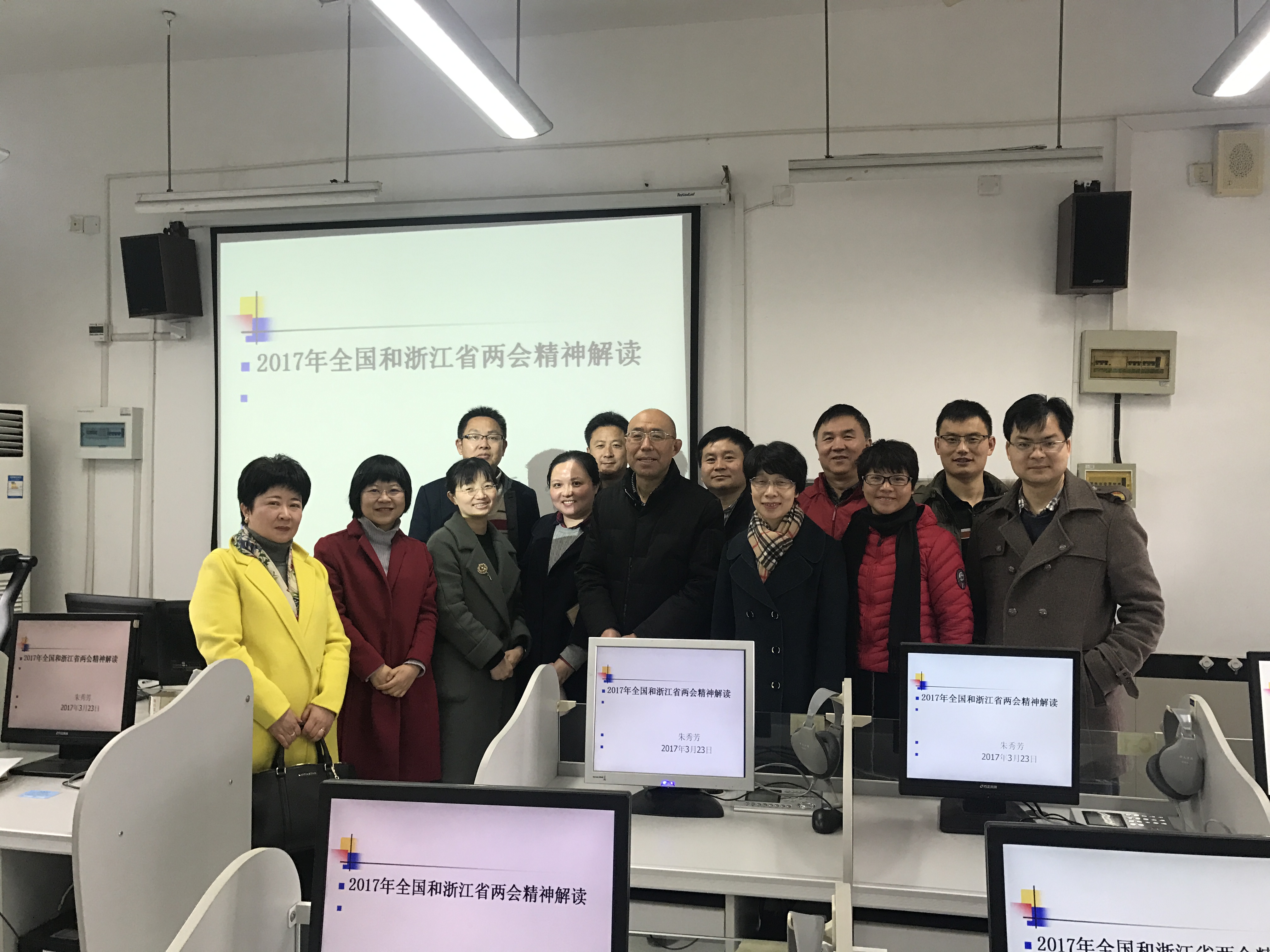 《形势与政策》教研室朱秀芳教授主讲全国、浙江省“两会”精神学习。朱教授重点介绍了“两会”部署的2017年全国、浙江省的主要任务,强调了本年度全国、全省工作的重点, 并提出了在思政课教学中应讲解的内容。潘迎华主任主讲了省委书记夏宝龙在省高校思想政治工作会议上的讲话,并根据讲话精神提出了本部门思政课教学应坚持“四个意识”,强调了师德师风教育的重要性,并根据省里要求将学生社会实践与我省“拆、治、归”工作结合,引导学生了解省情,认识中国特色社会主义在浙江的实践,将同学们的专业教育与意识形态教育结合起来,增强学生的道路自信、理论自信、制度自信和文化自信。